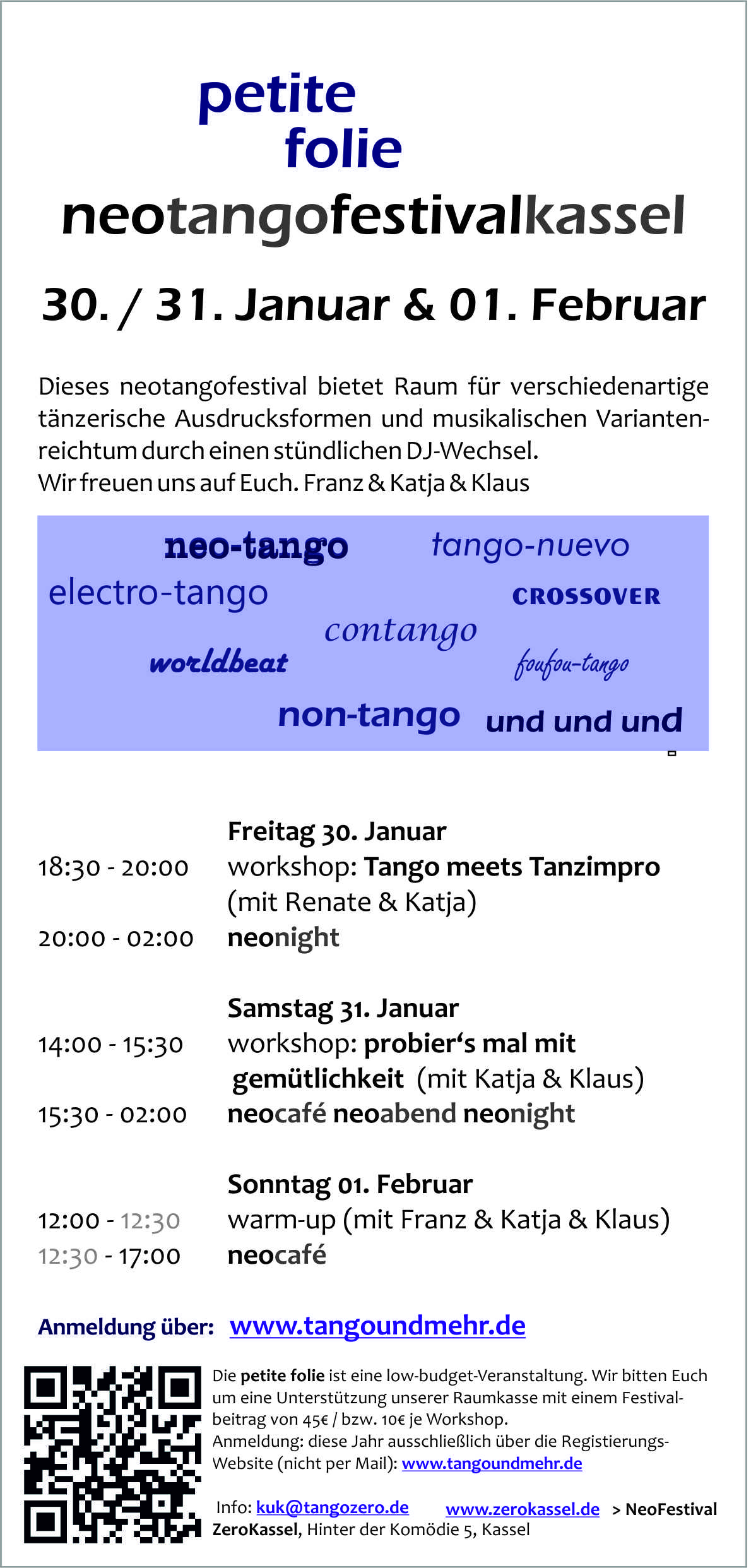 Diese Tango-und-Mehr-Website dient derzeit als Plattform für die Anmelde-Registrierung zur Petite Folie 2026. Die Anmeldungen sind ausschließlich über einen der untenstehenden Registrierungslinks möglich (nicht per Mail). Zudem kannst du dich für einen Workshop anmelden (in diesem Jahr pro Person nur ein WS) [ Zeitplan als PDF in neuem Fenster].