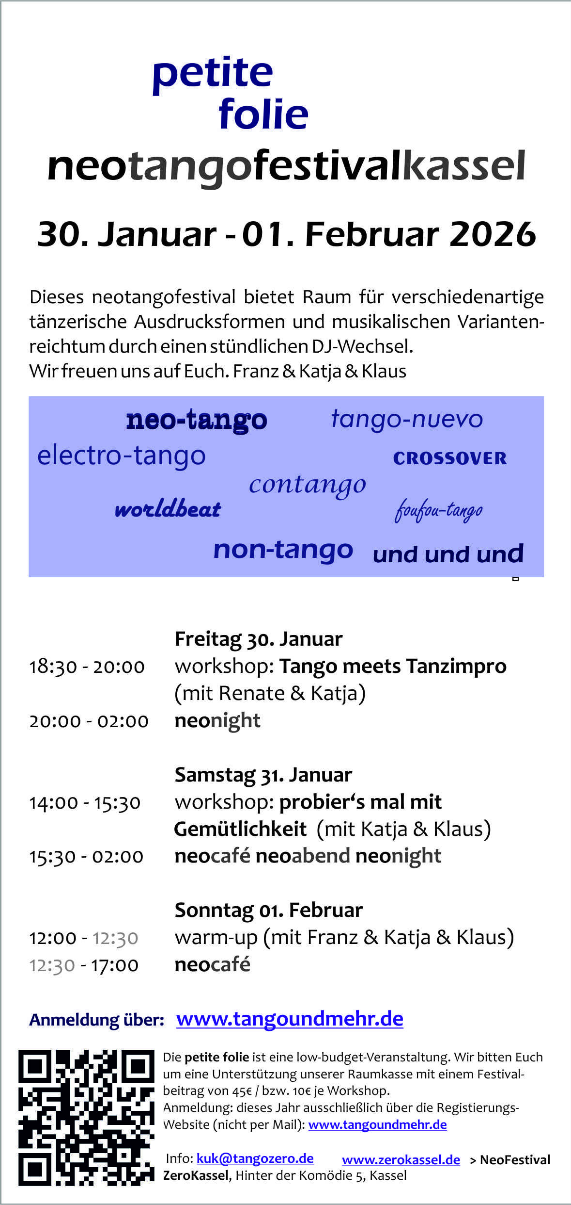 Wenn Ihr Interesse an einer Teilnahme der nachfolgenden Petite Folie 2027ff habt, können wir Euch in den Newsletter aufnehmen, mit dem wir die Ankündigungen für die Petite Folie und organisatorische Hinweise dazu, bzw. auch zum NeoTango im Zero-Kassel versenden.